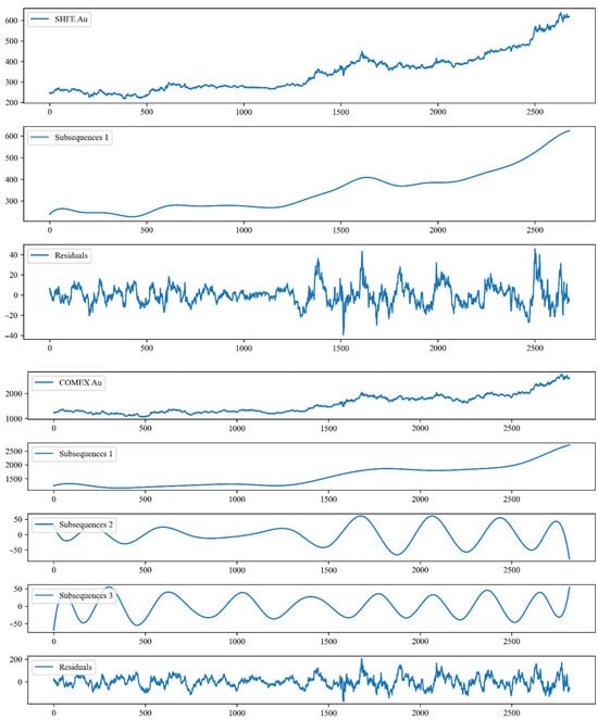 Decomposition of gold futures prices from SHFE (top) and COMEX (bottom). In each set, the first subplot shows the original price series, the middle subplot presents the extracted long-term trend, and the last subplot displays the residual component.