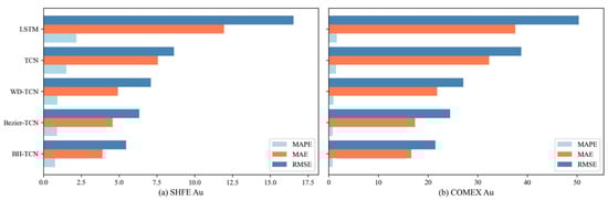 Figure 6 presents the histogram results of main models based on MSE, MAE, and MAPE, providing a visual comparison. It can be observed that the histogram height of the BH-TCN model is the lowest across all metrics, indicating that it achieves the best results with minimal prediction errors. This confirms the effectiveness and superior predictive capability of the BH-TCN model for metal futures prices. The of the BH-TCN model on the SHFE Au is 0.990741, and the of the BH-TCN model on the COMEX Au is 0.994525, both outperforming other comparative models and demonstrating stronger fitting ability (see Table 5). Additionally, the model obtained values of 0.542056 and 0.532710, ranking at a relatively high level among all methods, indicating greater stability in prediction results. In contrast, models such as Bézier-TCN, WD-TCN, standard LSTM, and TCN exhibited slightly inferior performance in both and metrics, suggesting potential instability when handling complex prediction scenarios. Conventional time series and machine learning models demonstrated significantly weaker performance compared to deep learning and hybrid models on both datasets, with limited fitting ability and lower stability. In comparison, the BH-TCN model more effectively captures the complex dynamic changes in time series, maintaining stable and low prediction errors, thereby exhibiting superior cross-market generalization capability.