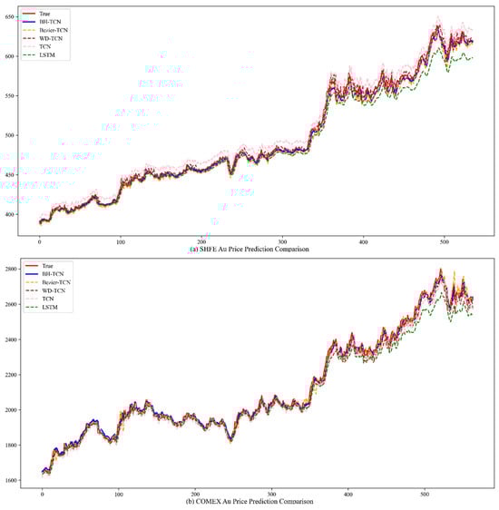As demonstrated by the experimental results in Table 4, the BH-TCN model consistently outperforms other methods, delivering superior predictive accuracy across both SHFE Au and COMEX Au datasets. In the SHFE Au dataset, the RMSE, MAE, and MAPE values are 5.4694, 3.9083, and 0.7644, respectively, markedly outperforming the other benchmark models. In the COMEX Au dataset, the BH-TCN model similarly exhibits superior performance, with RMSE, MAE, and MAPE values of 21.4865, 16.6375, and 0.7708, respectively. This demonstrates the model’s strong generalization capability. In summary, the BH-TCN model outperforms ARIMA, SVR, XGBoost, LSTM, and TCN across RMSE, MAE, and MAPE metrics. Moreover, compared to other TCN-based improved models (Bézier-TCN, WD-TCN), BH-TCN also exhibits a significant advantage.