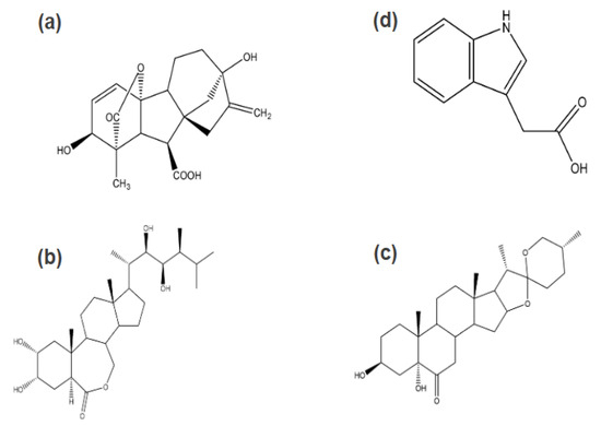 Structures of the ligands evaluated: (a) gibberellic acid (GA3), (b) brassinolide (BL), (c) agavenin (AG), and (d) indoleacetic acid (IAA).