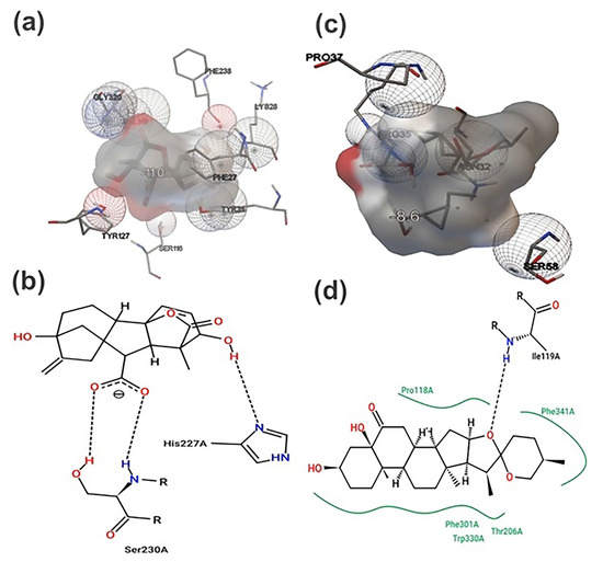 Molecular Docking with GA3Ox2 receptor and 2D interaction map. (a,b) Gibberellic acid (GA3) and (c,d) agavenin (AG).