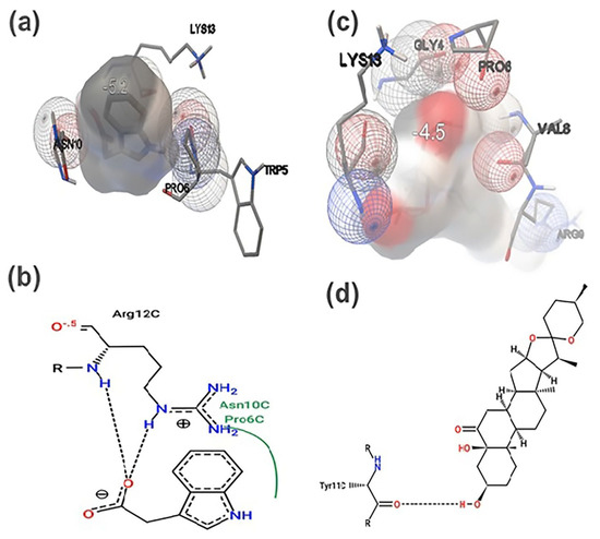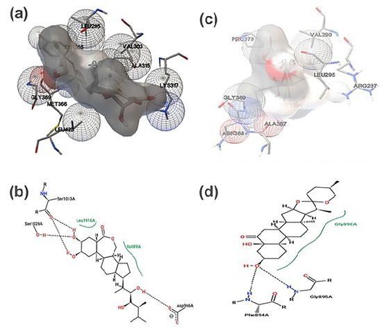 Molecular Docking with BRI1 receptor and 2D interaction map. (a,b) brassinolide (BL) and (c,d) agavenin (AG).