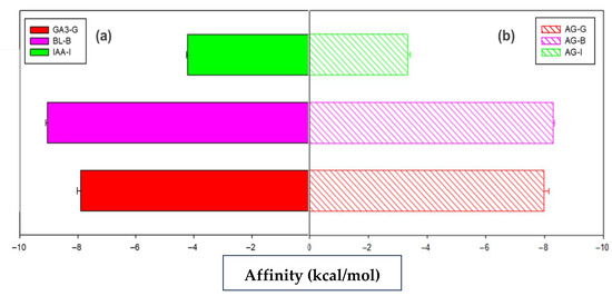 Binding affinity energies (mean ± SE) of each ligand–receptor interaction obtained from molecular docking simulations. Solid bars represent endogenous ligands (a): gibberellic acid (GA3, red), brassinolide (BL, magenta), and indoleacetic acid (IAA, green). Hatched bars represent agavenin (b) (AG) docked to each corresponding receptor: GA3Ox2 (AG–G), BRI1 (AG–B), and IAA7 (AG–I). More negative values indicate stronger predicted binding affinity.