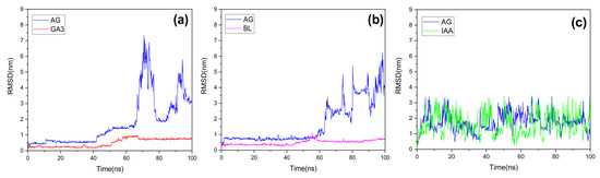 RMSD (Root Means Square Deviation) plots for complex ligand-receptor. Endogenous PGRs: (a) gibberellic acid (GA3), (b) brassinolide (BL), (c) indoleacetic acid (IAA). Agavenine (AG) (blue). KPR: Gibberellic (GA3Ox2), auxin (IAA7), and brassinolide (BRI1).