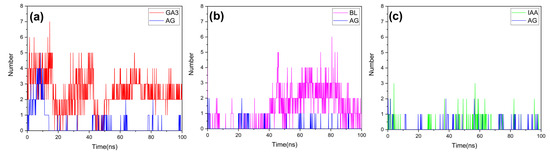Molecular dynamics for hydrogen bonds between endogenous PGRs vs. agavenine (AG, blue) and receptors. (a) GA3Ox2 receptor and gibberellic acid (GA3), (b) BRI1 receptor and brassinolide (BL), (c) IAA7 receptor and indoleacetic acid (IAA).