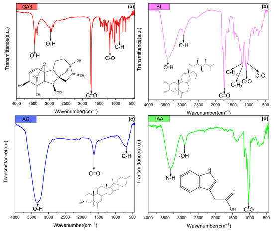 Fourier transform infrared spectroscopy (FTIR) spectrum: (a) gibberellic acid (GA3), (b) brassinolide (BL), (c) agavenin (AG), and (d) indoleacetic acid (IAA).