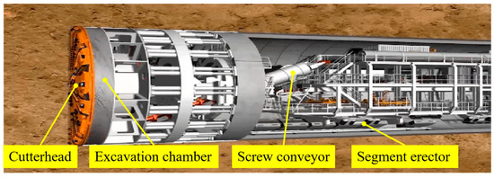 The structural configuration of an EPB shield (Figure 1) illustrates its main components, including the cutterhead, excavation chamber, screw conveyor, and segment erector. Its operation follows a cyclic process: excavation is performed by the cutterhead, chamber pressure is controlled through conditioned soil, muck is discharged by the screw conveyor, and lining segments are installed to provide ground support. This closed-loop mechanism ensures continuous advance while maintaining face stability and construction safety in complex environments.