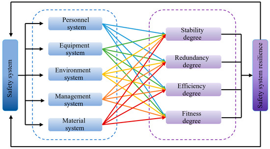 In the initial phase, the system is maintained in a stable and secure condition. When risks or disruptions arise, the condition of the system is assessed through resilience attributes including stability, redundancy, efficiency, and fitness. As the system’s capacity to absorb risk diminishes, the five subsystems (personnel, equipment, environment, management, and material) collaborate to implement emergency actions. Through recovery, the system stands a chance of being brought back to its former safe condition or even achieving a safer state compared to what it was initially [38]. Alternatively, various factors could lead to the system facing damage and result it into an unsafe condition.