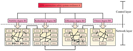 Marginal indicators with extremely low entropy values and insufficient discriminatory power are eliminated based on entropy weights and TOPSIS ranking results [44,45,46]. An EPB shield tunneling safety resilience indicator system is ultimately established. This system comprises 1 objective layer, 4 primary resilience dimensions, 20 secondary indicators, and 35 tertiary indicators (Table 1).