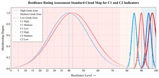 where is the expected value, is the entropy value, and is the hyper-entropy value. For D2, the high-resilience cloud model was defined as (97.5, 2.5, 0.1). Substituting, the resulting membership degrees were: High resilience: 0.962, Medium resilience: 0.038, Low resilience: 0.000.