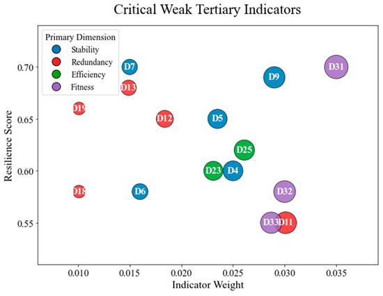 Figure 8 visualizes the critical weak tertiary indicators identified in the resilience assessment. Bubble size corresponds to indicator weight, while color differentiates the primary dimensions. This visualization highlights that indicators such as D32 (tail seal resistance) and D23 (segment erection speed) not only score low, but also exert significant influence on overall resilience, making them priority targets for improvement.
