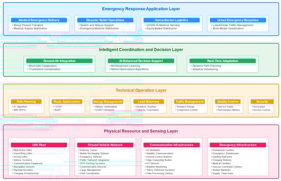 UAV delivery and ground transfer scheduling in emergency scenarios involve deep integration and system-level coordination across multiple technological layers. This section systematically analyzes the technological architecture, methodological innovations, and practical applications in this field along eight core technological dimensions, constructing a comprehensive technology system framework.