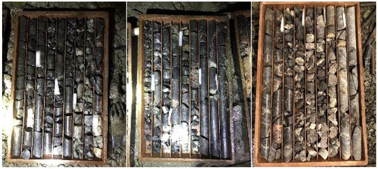 The western mining section of Yanqianshan Iron Mine is located west of the F19 fault as shown in Figure 1, striking NE with a dip angle of 70–85°. The structural features of the western section include a weakly weathered drill core exhibiting localized fracturing, fracture fillings predominantly composed of quartz, and joint surfaces characterized primarily by a rough, undulating morphology with subordinate smooth planar features. Rock Quality Designation (RQD) measurements indicate that magnetite quartzite in the western orebody ranges from 17.1% to 90.0%, with an average of 53.5%, with a mean joint spacing of 0.16 m, and an average joint density of 6.5 joints/m. Representative drill core photographs are shown in Figure 2. The rock mass in the mining area is generally classified as low basic quality, deteriorating to poor in severely argillized zones of the orebody. While the ore exhibits a relatively high strength, the overall stability of the orebody and its immediate roof and floor strata is moderate. However, in structurally complex areas with well-developed faults, intense jointing and fracturing result in fragmented rock masses, creating adverse conditions for mining operations.