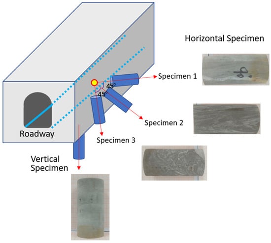 Rock core sampling was conducted from the roadway floor at the −285 m level in the western mining section of the Yanqianshan Iron Mine. As illustrated in Figure 3, the oriented cores were first retrieved from the roadway floor in the field, and then small specimens (25 mm × 50 mm) in four orientations (vertical, and 0°, 45°, and 90° in the horizontal plane) were prepared through secondary coring in the laboratory. Utilizing the Kaiser effect of rock materials, uniaxial compression acoustic emission tests were performed on processed in situ stress testing specimens using an MTS testing machine coupled with an acoustic emission monitoring system. The system automatically recorded acoustic emission amplitude and absolute energy data. During cyclic loading–unloading and secondary loading sequences, cumulative acoustic emission counts and absolute energy values were statistically analyzed. The characteristic Kaiser point was identified by evaluating the Felicity ratio during secondary loading. By calculating stress values corresponding to Kaiser effect points from spatially oriented cores, the magnitude and orientation of the maximum horizontal principal stress at the measurement point were determined. Through the direct measurement of vertical principal stress and the indirect computation of two horizontal principal stresses, in situ stress values at varying depths were analyzed to establish regional stress field distribution patterns.