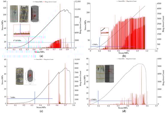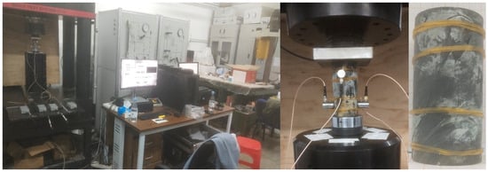 The experimental program employed an MTS 816 rock testing system integrated with a Physical Acoustics Corporation (PAC) acoustic emission monitoring system. Displacement-controlled loading was applied at rates of 0.05 mm/min and 0.1 mm/min during two-stage loading–unloading cycles. The acoustic emission system was configured with a 40 dB pre-amplifier gain and 45 dB noise threshold, as illustrated in Figure 4.