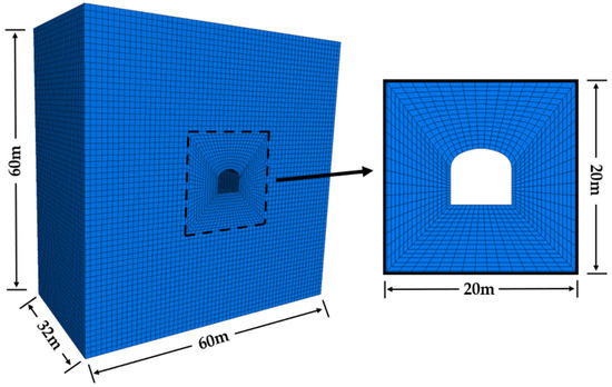 Taking the −285 m ore-drawing roadway west of the F19 fault as the research object, the cross-cut in the western section is arranged approximately perpendicular to the orebody strike, featuring a three-centered arch section with a 3.1 m straight wall height, 5.2 m clear width, and 1.7 m arch rise. Considering boundary effects, the model dimensions were set to 60 m × 32 m × 60 m (length × width × height). Local mesh refinement was implemented around the roadway. According to in situ stress distribution patterns, boundary stresses were applied: maximum principal stress 17.39 MPa, minimum horizontal principal stress 6.82 MPa, vertical stress 6.5 MPa, with a lateral pressure coefficient of 2.67. The model contained 145,920 elements and 154,473 nodes, adopting the Mohr–Coulomb constitutive model. Experimentally determined rock mass mechanical parameters were assigned, and the established finite element model is shown in Figure 6.
