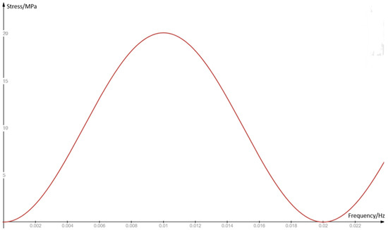 The orebody in the western section of the Yanqianshan Iron Mine is thick and relatively stable, with a near-vertical massive structure. At the −285 m level, the maximum caving height is 218 m and the average caving height is 189 m, indicating easy-to-moderate cavability. According to the ore-drawing conditions of the natural caving method at the western end of the Yanqianshan Iron Mine, numerical modeling was used to simulate the cyclic impact load caused by caved ore above ore-drawing roadways. The load waveform of dynamic disturbance waves in a rock mass can adopt a segment of harmonic waves in simulation [26,27]. Based on ore-drawing and extraction patterns, a cosine stress wave was selected to apply dynamic load to the model, as shown in Figure 7.