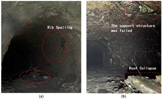 The field investigation and stability assessment of surrounding rock at the Yanqianshan Iron Mine reveal three primary failure modes in ore-drawing roadways—overall convergence, roof collapse, and rib spalling. Roof collapse occurs when fractured surrounding rock with developed joints undergoes local support instability, causing detachment under tensile stress. Rib spalling results from compressive–shear stress acting on fractured rock masses. Overall convergence manifests through the severe deformation of ribs and roof–floor interfaces or asymmetric pressure loading, leading to integral roadway contraction. Unsatisfactory long-term stability persists in unsupported or conventionally supported roadways, as shown in Figure 8, resulting in rational support strategies for ore-drawing roadway integrity maintenance.