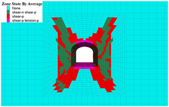 The plastic zone from the numerical simulation of initial roadway deformation and failure is shown in Figure 9. Due to the high lateral pressure coefficient, the surrounding rock exhibits a marked rockburst tendency [28]. The plastic zone exhibits a butterfly-shaped distribution, indicating a progressive failure mode with a high strain concentration and extreme sensitivity to external disturbances, making it prone to malignant propagation. According to the simulated displacement results shown in Figure 10, shear failure dominates the surrounding rock damage. Tensile–shear failure occurs in shallow roof and floor areas. Maximum roof deformation exceeds 8 mm, floor deformation reaches 6.5 mm, and rib displacement reaches 4.3 mm.