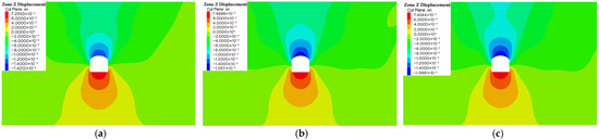 Roof displacement under drawing disturbance: (a) 10 cycles; (b) 20 cycles; (c) 50 cycles.