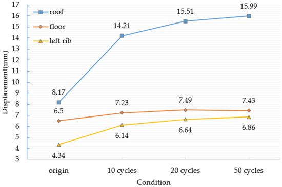 Displacement monitoring points were installed on the roof and ribs to observe the dynamic characteristics of roadway displacement. The relationships between displacement and the number of disturbance cycles at these monitoring points are plotted in Figure 13. The resultant displacement plots are shown in Figure 14. After 50 ore-drawing disturbance cycles, the maximum displacement rapidly increased during initial disturbance application before asymptotically approaching a stable value. Roof displacement increased from 8 mm to 16 mm, while rib displacement rose from 4.2 mm to 6.8 mm. These results demonstrate that early-stage caved ore disturbances significantly impact surrounding rock deformation, necessitating prompt roadway support implementation.