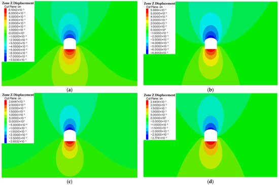Displacement nephogram of roadway under different support schemes: (a) Scheme ①; (b) Scheme ②; (c) Scheme ③; (d) Scheme ④.