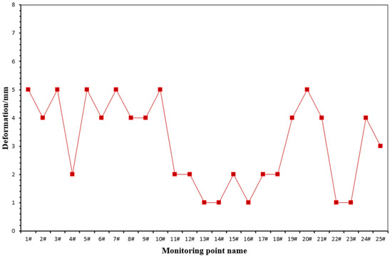 Field monitoring data recorded 90 days after support implementation revealed displacement differentials (maximum minus initial values) at each monitoring point, as shown in Figure 20.