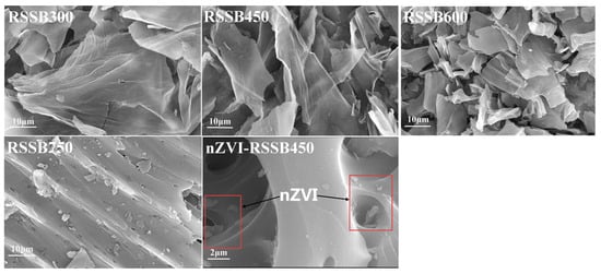 In order to comprehensively explore the structural properties of RSSB and nZVI-RSSB450, several different types of characterization and analysis were performed on them. Figure 1 is a SEM image of RSSB and nZVI-RSSB450. RSSB gradually becomes fragmented with high-temperature carbonization, and the surface is smooth. And as the temperature continues to increase, RSSB carbonizes more completely and the fragmentation is more obvious. When the temperature reached 750 °C, RSSB began to deform and partially collapsed, indicating that overly high temperature would cause some damage to the structure of biochar [40]. When nZVI was loaded on the biochar surface, fine particulate matter appeared on the biochar surface and porous structure, indicating that nZVI was successfully loaded on the biochar. Due to nZVI’s inherent magnetic properties and high surface energy, it easily agglomerates into large particles. After being combined with biochar, the biochar carrier can prevent it from forming a large area of stacking structure, which promotes its distribution more uniformly, thereby improving the solution to the nZVI aggregation problem [25,41].