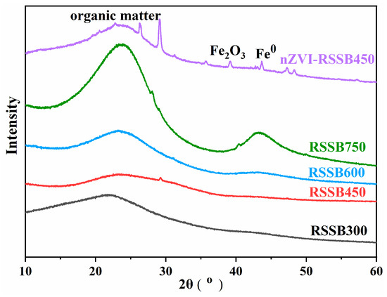 The crystallinity and material structure of RSSB and nZVI-RSSB can be further understood through XRD spectra (Figure 4). The diffraction peaks appearing at 15–30 are mainly carbon-containing organic compounds, and with the increase in preparation temperature, the diffraction peaks of biochar materials are more obvious, indicating that the content of organic components in the materials increases. The XRD pattern showed that the main peaks of nZVI-RSSB450 were not only the peaks of organic components, but also the characteristic peaks of Fe0 and the weak oxidation peaks of iron oxide, which proved the formation of zero-valent iron. And the appearance of weak oxidation peaks could be caused by the oxidation of nZVI-RSSB450 during preparation, drying and storage [47]. The rapid oxidation of nZVI was inevitable and detrimental to heavy metal removal, but this defect could be minimized by aging nZVI under controlled oxygen exposure to form a stable shell [33].