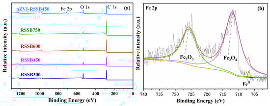 XPS spectra were used to further examine the structure of the different biochars (Figure 5a,b). Broad scan spectra showed that Fe 2p, O 1s, C 1s photoelectron peaks were observed, and with the increase in preparation temperature, the C 1s peak gradually increased and the O 1s peak gradually decreased. The results were similar to those of the XRD analysis. Further analysis from the Fe 2p peak showed that peaks at 725.7 eV and 711.8 eV were assigned to Fe2O3 and Fe3O4, respectively, and the weak peak at 706.8 eV was assigned to Fe0 [51]. The presence of Fe2O3 and Fe3O4 peaks also verified the aging phenomenon during the preparation of nZVI-RSSB450, indicating that an iron oxide shell coating was formed, thus delaying the aging of Fe0, so the peak of Fe0 was not detected obviously, which was consistent with the results of XRD analysis [33].