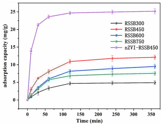 RSSB300, RSSB450, RSSB600 and RSSB750 were tested for Cd (II) adsorption under the same parameters, and the adsorption capacities were compared in order to screen the optimal pyrolysis temperature. As shown in Figure 6, the adsorption capacities of Cd (II) by the four materials were 4.90 mg/g, 12.12 mg/g, 9.50 mg/g, and 7.55 mg/g, respectively, among which RSSB450 had the highest adsorption capacity, which was more than double that of RSSB300. This is because RSSB450 has a good carbonization degree, contains more hydroxyl functional groups, has a more porous structure, has a larger contact area with Cd (II), and has better adsorption capacity than those prepared at other temperatures [52]. RSSB450 was selected to be modified to load nano zero-valent iron to obtain nZVI-RSSB450. Under the same parameters as the above materials, the adsorption capacity of Cd (II) was obtained as shown in Figure 6. The adsorption capacity of Cd (II) on nZVI-RSSB450 reached 25.17 mg/g, which was more than double that of RSSB450. nZVI has abundant active surface sites and high reactivity, but due to its small particle size, it is easy to agglomerate and oxidize, and nZVI-RSSB450 can effectively solve these shortcomings of nZVI [20]. The results show that the biochar carrier decomposed at medium temperature is beneficial to the removal of Cd (II), and that the modified treatment significantly improves the adsorption capacity of RSSB450. The adsorption capacity of Cd (II) by nZVI RSSB450 is much higher than that of RSSB450, and it can efficiently adsorb Cd (II) from water.
