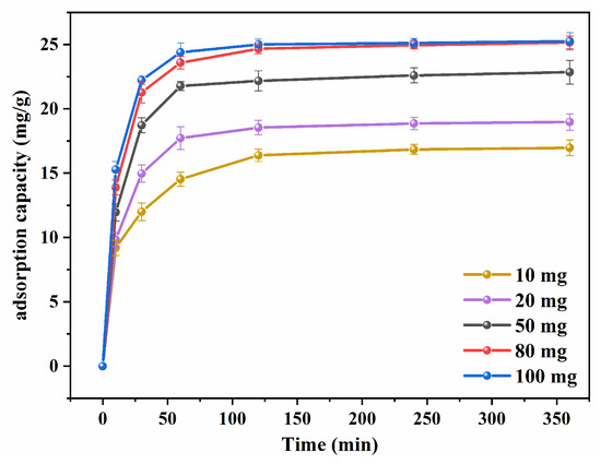 As shown in Figure 7, the adsorption capacity of Cd (II) increased with the increase in adsorbent dosage. After 360 min of reaction, when the dosage of nZVI-RSSB450 was 10, 20, 50, 80, and 100 mg, the adsorption capacity of Cd (II) was 16.98 mg/g, 18.98 mg/g, 22.86 mg/g, 25.17 mg/g, and 25.26 mg/g, respectively. This was because Fe0 dissolved Fe2+ and active sites increased with the increase in nZVI-RSSB450 dosage, which consequently increased the Cd (II) removal capacity [53]. When the dosage of nZVI-RSSB450 was 100 mg, the removal capacity of Cd (II) did not increase, compared with the 80 mg dosage. Considering economy, the dosage of nZVI- RSSB450 is 80 mg for the Cd (II) adsorption test.