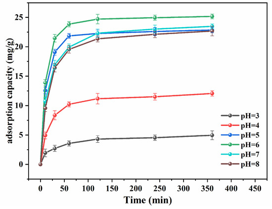 The initial pH of the solution is an important factor affecting the adsorption of nZVI-RSSB450. The pH has a significant effect on the morphological distribution, ionization degree and surface charge of the adsorbent [55]. Figure 9 shows the change in Cd (II) adsorption capacity within 360 min under a series of pH values (3~8). At pH = 3.0~6.0, the adsorption removal of Cd (II) increased with the increase in initial pH, and the adsorption capacity reached the maximum at pH = 6. Subsequently, the adsorption capacity of Cd (II) decreased in the range of pH 6.0~8.0, but there was no sharp decline, indicating that nZVI-RSSB450 had pH adaptability and buffering capacity, and could maintain good adsorption capacity at higher pH values. From the results, it appears that nZVI-RSSB450 in weak acid to neutral solution for Cd (II) removal effect is good. When the pH value is low, the proton occupying the active site suppresses the electrostatic interaction through protonation of functional groups [56]. In addition, protons attack the adsorbed heavy metals, causing them to dissociate from the solid phase [57]. In addition, most Cd (II) in the solution at low pH exists as Cd2+ ions, which are not easily adsorbed [58]. Meanwhile, high concentrations of H+ at low pH promote the dissolution of nZVI, greatly reducing the adsorption sites. Conversely, as pH increases, protonated functional groups undergo deprotonation and active sites are released [59]. In addition, the increase in the pH value is conducive to the formation of Fe hydroxide and inhibits the dissolution of Fe oxide. Due to the rich hydroxyl ions on the surface of nZVI-RSSB450, the increase in pH value is also conducive to the formation of CdxFe(1−x)(OH)2 precipitate [60]. The removal of Cd (II) by nZVI-RSSB450 increased with the increase in pH value, indicating that precipitation and coprecipitation play a crucial role in Cd (II) fixation [61]. In conclusion, the increase in the initial pH value is an important factor affecting Cd (II) removal, a higher pH value is conducive to Cd (II) adsorption, and Cd (II) adsorption is optimal when the initial solution pH is 6. Electrostatic adsorption and precipitation/coprecipitation may be involved in Cd (II) removal by nZVI-RSSB450.