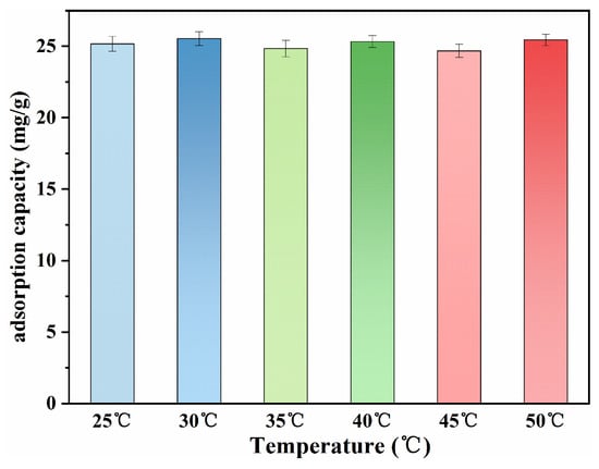 Adsorption experiments were performed on nZVI-RSSB450 at different temperatures prior to isothermal adsorption (Figure 10). The results showed that temperature had little effect on the amount of Cd (II) adsorbed by nZVI-RSSB450 in the range of 25–50 °C. Therefore, isothermal adsorption experiments were performed on nZVI-RSSB450 at a constant room temperature of 25 °C by varying the initial Cd (II) concentration, and the adsorption isotherm of RSSB450 was analyzed as a comparison.
