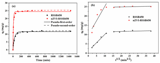 Based on the adsorption kinetics model, the adsorption kinetics of Cd (II) on nZVI-RSSB450 at pH 6 were studied, and the adsorption kinetics of Cd (II) on RSSB450 were analyzed as a comparison (Figure 11a). The adsorption capacity of RSSB450 and nZVI-RSSB450 for Cd (II) increased sharply from the beginning, and the adsorption of Cd (II) on nZVI-RSSB450 reached equilibrium faster. This was because there were abundant adsorption sites on the surface of the adsorbent, and a high initial Cd (II) concentration quickly occupied a large number of adsorption sites [62]. As the adsorption time increased, the adsorption process became slow and eventually entered a stable state. This could be due to the decrease in available adsorption sites [63].