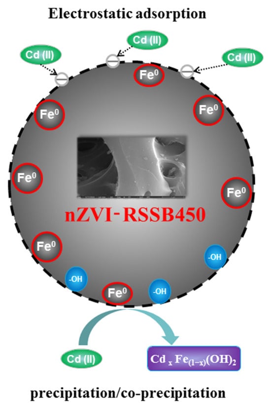 In this study, RSSB at different temperatures was first prepared, and the optimum temperature of RSSB450 was determined through adsorption screening experiments, and nZVI-RSSB450 was prepared by the liquid phase reduction method as the supporting material. The results showed that nZVI was successfully attached to the surface of RSSB450, and RSSB450 could effectively improve the stability and reactivity of nZVI and increase its surface active sites. The adsorption properties of nZVI-RSSB450 were affected by the dosage of the material, the initial concentration of Cd (II) and the pH of the solution. The adsorption mechanism mainly includes electrostatic adsorption and precipitation/co-precipitation (Figure 14). Through the adsorption experiment in actual water, it was found that nZVI-RSSB450 had a synergistic adsorption effect on various metals, which further verified the application potential of nZVI-RSSB450 as an adsorbent for the removal of heavy metals from water. Therefore, nZVI-RSSB could be an environmentally friendly and economical material for the treatment of wastewater containing heavy metals.