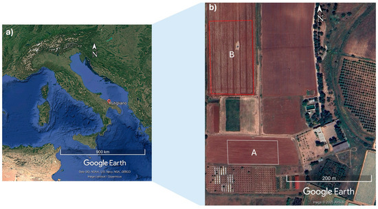 Location of the experimental farm in southeastern Italy (a); experimental plots (b) where cotton was grown in 2023 (A) and 2024 (B).