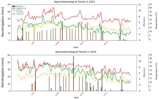 Irrigation was supplied via surface drip lines with 4 L h−1 emitters at 30 cm spacing. The daily crop water use was computed with the FAO-56 approach: the reference evapotranspiration (ETo) from the FAO Penman–Monteith equation; the crop evapotranspiration, ETc = Kc × Eto, using tabulated Kc values (Kcini = 0.15; Kcmid = 1.10; Kcend = 0.50); and a management allowable depletion, p = 0.50, with stage-specific adjustments (FAO-56 recommendations) [31]. The net irrigation requirement was calculated as IN = ETc − effective rainfall, and the irrigation scheduling targeted 100% of IN. During peak demand (July–August), irrigations were typically executed at short intervals to track the rising ETc. The distribution of irrigation events for each year is reported in Figure 2. All the meteorological inputs were recorded by the on-farm agrometeorological station installed within the experimental area.