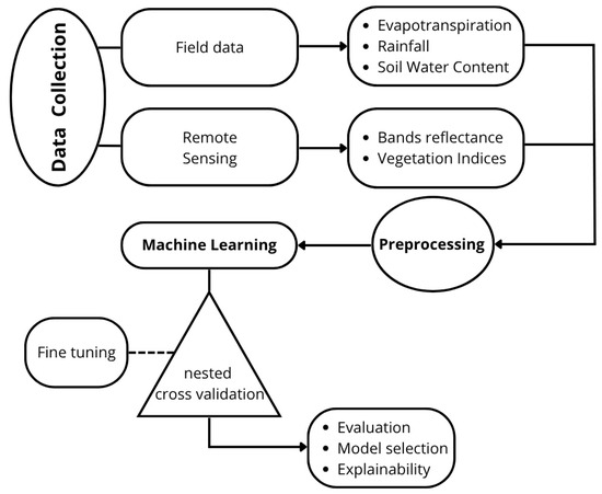 A flowchart showing the study workflow. The soil water content was considered the target prediction of the machine learning analysis; the evapotranspiration, rainfall, and remote sensing data were used as the predictors.