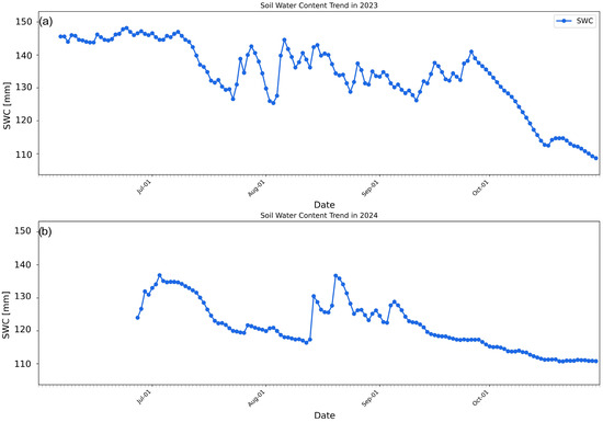 The observed SWC values across the 0.40 m soil profile exhibited different trends throughout the growing seasons, reflecting the influence of climatic conditions and irrigation events (Figure 4). In 2023, the SWC demonstrated stability, maintaining values of ~145 mm from the beginning of monitoring (6th of June). A gradual rise was observed through the first ten days of July, followed by a subsequent decline until 23rd July, when it reached 126 mm. Thereafter, the trend exhibited variability, characterized by fluctuations in both the increases and decreases, depending on the irrigation and rainfall patterns. In 2024, the SWC exhibited a lower initial value compared to the previous year, starting at approximately 125 mm at the onset of monitoring (27th of June). A moderate increase was recorded during the first days of July, reaching values of ~135 mm. Then, the SWC showed a continuous decline throughout July and the first half of August. Increasing peaks of SWC were observed in the second half of August. From early September, the SWC continued to decrease steadily, with minor fluctuations in the first days of the month. Overall, 2024 was characterized by lower SWC values, a more pronounced and persistent decline, and less pronounced variability compared to 2023.