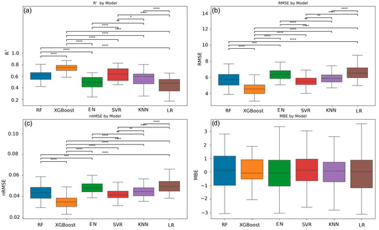 Model performance comparison for soil water content prediction of the regression algorithms: random forest (RF), extreme gradient boosting (XGBoost), elastic net (EN), support vector regression (SVR), k-nearest neighbours (KNN), and linear regression (LR). The boxplots show the distribution of out-of-fold scores from the nested cross-validation for each model in terms of the following: (a) coefficient of determination (R2); (b) root mean squared error (RMSE); (c) normalized RMSE (nRMSE); and (d) mean bias error (MBE). The central black line represents the median, while the lower and upper boundaries of the box correspond to the first (Q1) and third (Q3) quartiles, respectively. The asterisks indicate statistically significant differences between the models based on the Mann–Whitney U test (* p < 0.05; ** p < 0.01; *** p < 0.001; **** p < 0.0001).