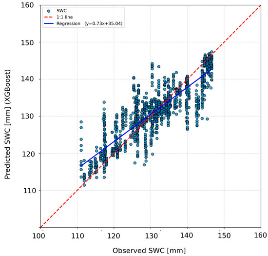 The XGBoost model demonstrated the best overall performance on SWC estimation, as shown by the cross-model evaluation. Figure 6 illustrates the comparison between the observed and predicted SWC values for XGBoost. The scatterplot shows that the predicted SWC values tend to follow the 1:1 line, with the regression line being close to the bisector. This indicates a generally good agreement between the predictions and observations, despite some residual dispersion.