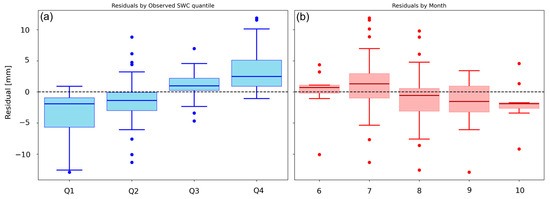 The residual analysis confirms the performance of XGBoost. Figure 7a shows the distribution of residuals across the observed SWC quartiles. The residual medians in each quartile are close to zero, confirming a reduced systematic bias across the entire SWC. However, there is a slight tendency for positive errors in Q1 and negative errors in Q4, suggesting a marginal overestimation of very low SWC values and a slight underestimation of higher peaks. In Figure 7b, the residuals are grouped by month, and a general tendency is also shown for the error distribution to be centred around zero throughout the growing season. Slight deviations are observed at the beginning and end of the season (June and October), where the residue medians show a slight overestimation at the beginning of the cycle and underestimation at the end of the cycle, respectively.