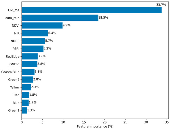 The feature importance analysis conducted using SHAP provided information on the impact of the predictors on the XGBoost outcomes. Figure 8 shows the percentage contribution of each predictor variable to the model’s decisions. The two agrometeorological variables, the ETo and cumulative rainfall, accounted for over 50% of the total predictive power. The ETo held approximately one-third of the overall importance. Among the remote sensing variables, the NDVI was the most informative (with an importance of 9.9%), followed by the NIR band (6.4%). The contributions of the other spectral indices had lower importances (the NDRE and the PSRI contributed 5.7% and 5.2%, respectively). The reflectance of the other single SDBs and GNDVI had relatively small percentage contributions (less than 5%).