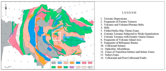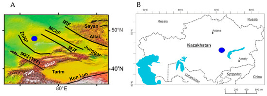 B). The blue circle indicates the area of the iron ore region of the northwestern Balkhash region. The main faults are as follows: MKF—Main Karatau and TFF—Talas-Fergana, ZhNF—Zhalair-Naiman, MJF—Main Junggar, MChF—Main Chingiz, IRF—Irtysh [
