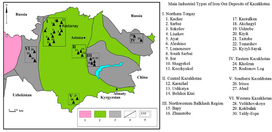 24]. The country contains the following iron ore regions: I. Northern Torgai; II. Atasu Region; III. Northwestern Balkhash; IV. Eastern Kazakhstan; V. Southern Kazakhstan; VI. Western Kazakhstan [