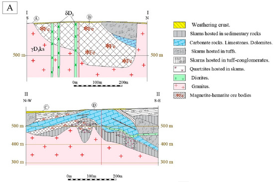 At the Zhuantobe deposit, two types of iron ores are distinguished: (1) skarn magnetite ores of contact-metasomatic genesis, (2) rare hydrothermal quartz-hematite ores that form veins. Skarn magnetite ores are composed of magnetite with a very small admixture of hematite, iron hydroxides, pyrite, chalcopyrite, and pyrrhotite. According to the study of the Zhuantobe deposit, two areas were distinguished: Western and Eastern (Figure 5 and Figure 6).