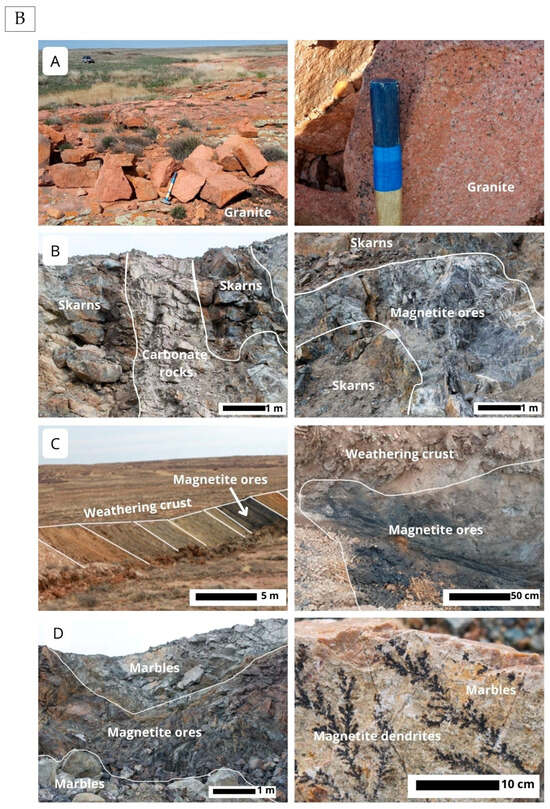 (A) Detailed geological cross-section of the Zhuantobe deposit: Western section, profile I–I; Eastern section, profile II–II. Compiled by the authors using data obtained from field investigations and documentation of mine workings. (B) Photographs of the outcrops. Letters in circles correspond to photographs of geological outcrops.