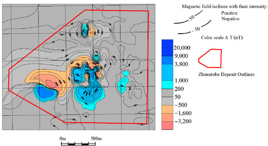 Map of the magnetic field of the Zhuantobe deposit. Positive anomalies correspond to ore-bearing skarn zones. The map was compiled using field investigation results and supplemented with data from geophysical surveys [