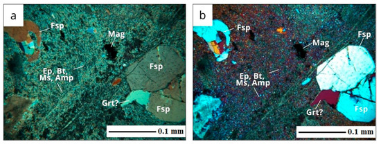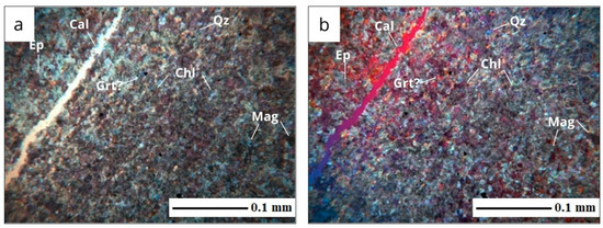 Calc–silicate rocks: (a) parallel nicols, (b) crossed nicols with compensator; magnification ×40. Conventional indices of minerals: calcite (Cal); magnetite (Mag); chlorite (Chl); epidote group minerals (Ep); quartz (Qz); probable garnet (Grt?).